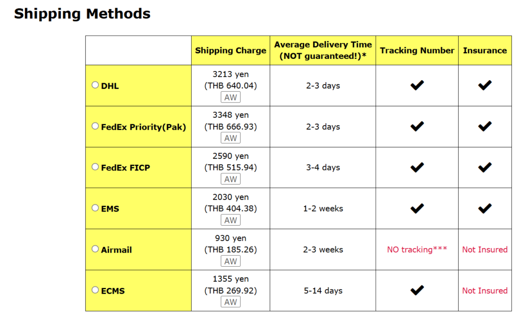 DHL200〜250バーツFedEx同様、爆速。事前にSMSで「これだけ税金かかるよ」と通知が来て、オンライン決済できる。